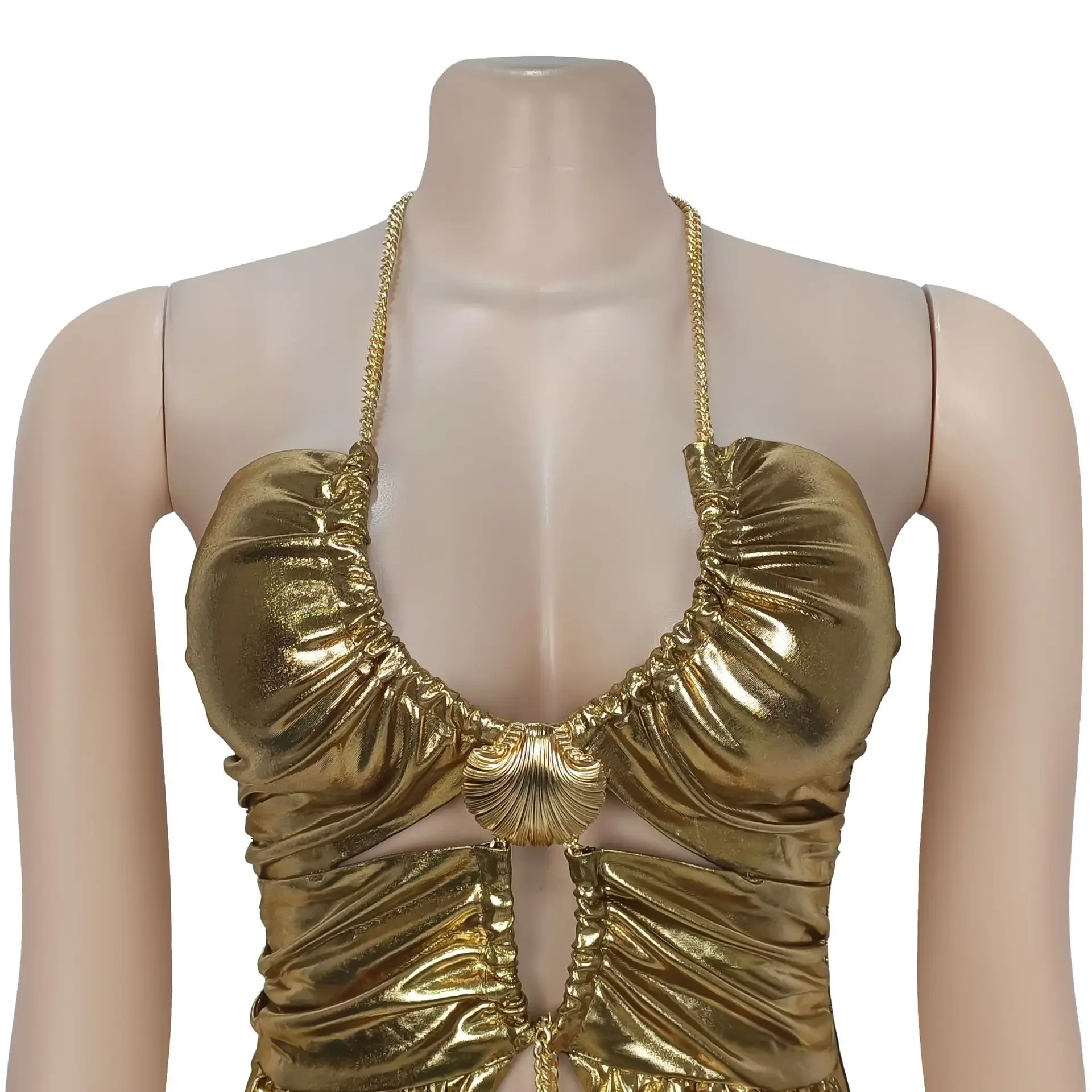Fashionable Sexy Off-Shoulder Golden Chain Pleated Arm-Enveloping Dress Cross-Border Elegant Women's Long Ankle Dress